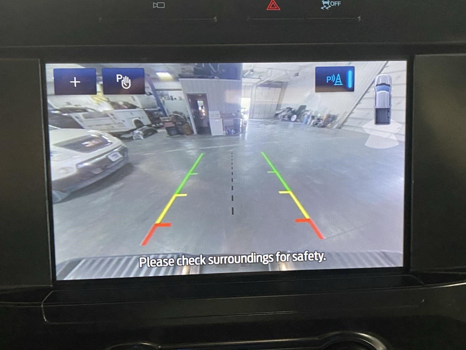 - The vehicle is equipped with a camera that displays an image of the area behind the vehicle on an interior display.